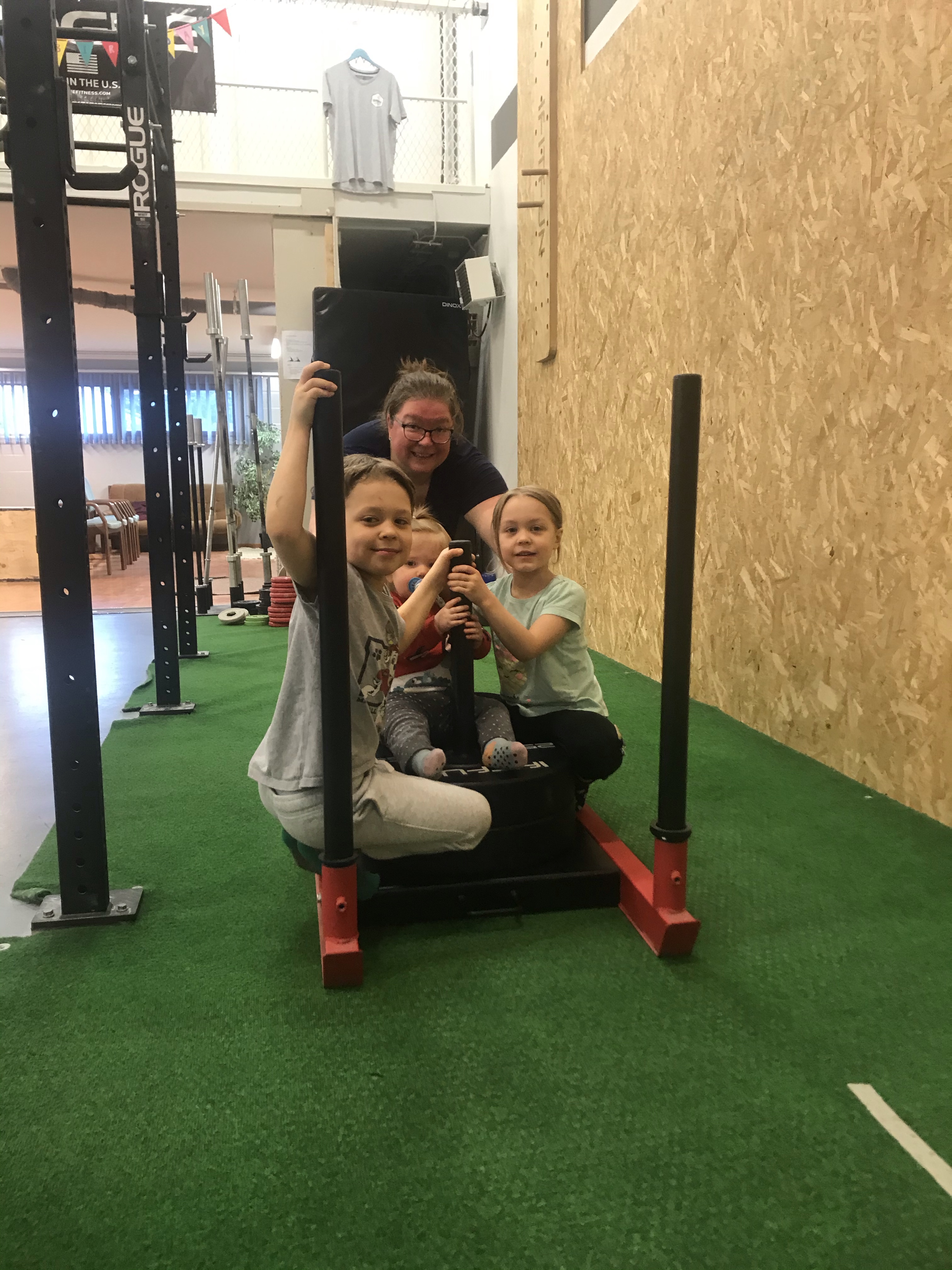 Kaksi lapsista jäi vielä maanantaihin saakka ja pääsivät heti hiihtolomaviikon aluksi mukaan CrossFit-treeneihini. Kelkassa kyydissä noin 90kg – 50kg painoa + kolme lasta.